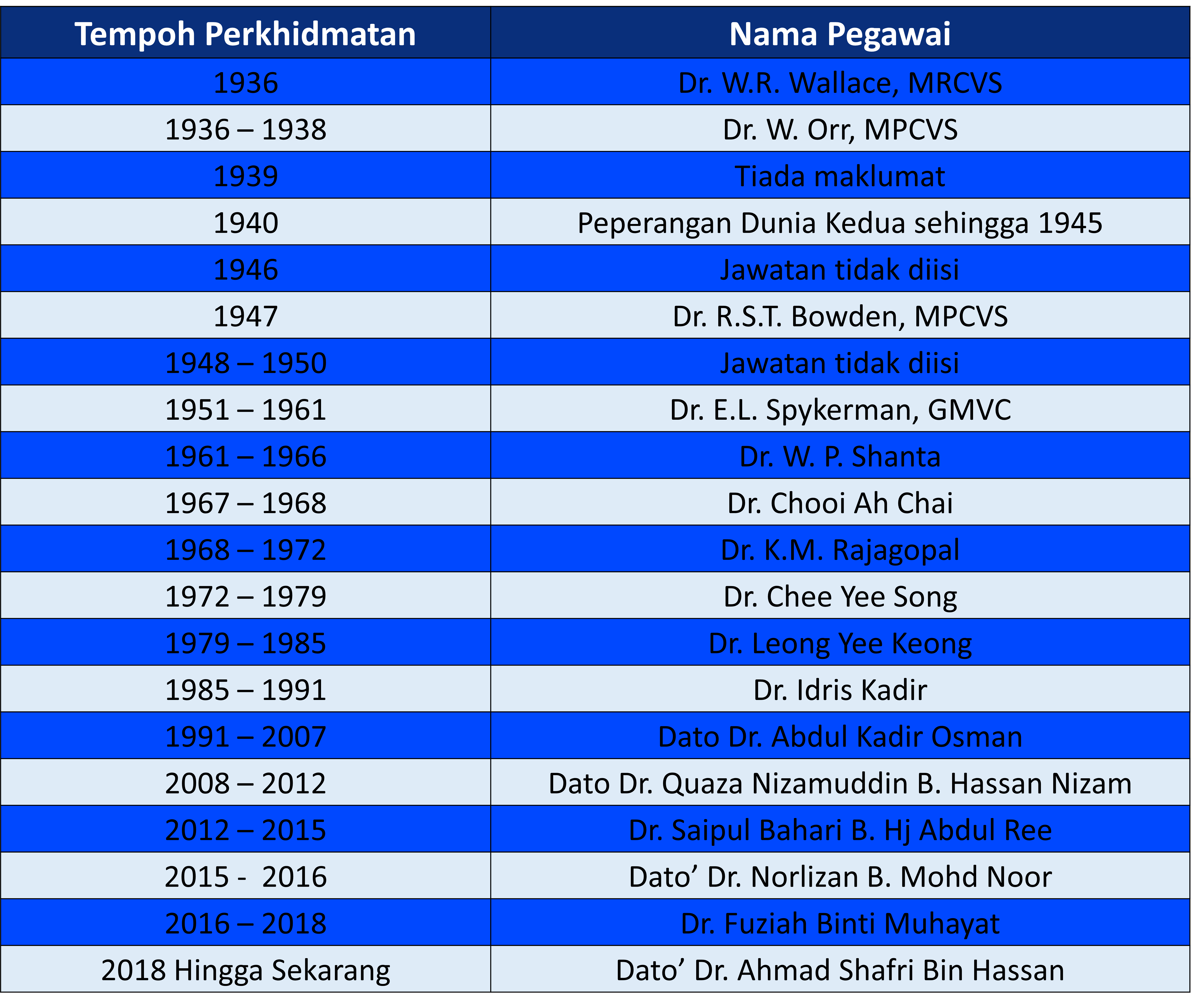 Sekitar tahun 1895 sehingga 1898, pegawai haiwan yang bertanggungjawab tidak dapat dipastikan. Walaubagaimanapun, pada bulan Oktober 1898 Sir G. Moir telah dilantik serta berkhidmat sebagai Pegawai Haiwan di Negeri Perak selama lebih kurang 29 tahun. Ketika itu, Sir G. Moir juga sering dipinjamkan ke negeri lain bagi tujuan mengawal penyakit haiwan.