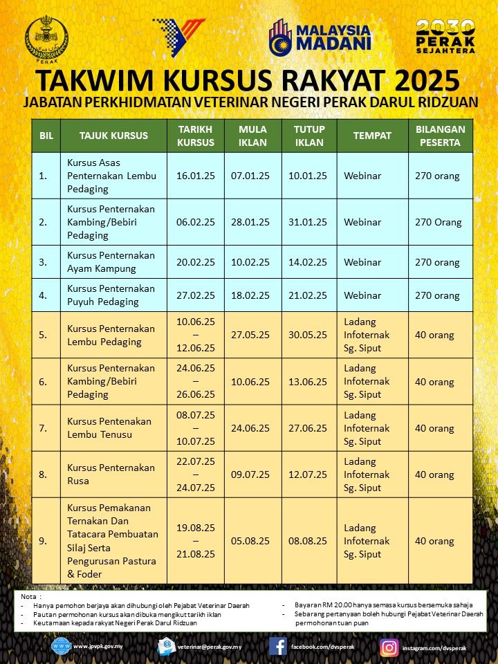 Untuk maklumat lanjut atau pertanyaan, sila hubungi Jabatan Perkhidmatan Veterinar Negeri Perak di talian, 05-545 9111 (sambungan Unit Latihan & Pembangunan Sumber Manusia).